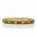 This bangle is one of the very first slide on bangles that I designed. I love all the intricate detailing on this bangle. The gold beaded edge around the entire border of the bangle and the iconic bezel set gold clovers will soon become your favorite bangle to stack with your other FR bangles!