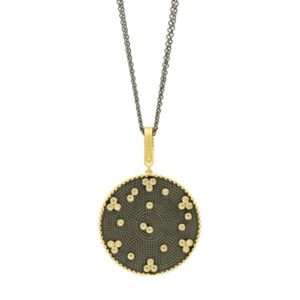 This iconic pendant is a statement maker! Inspired by Brooklyn, this Signature pendant necklace features a double-sided design for a two-in-one style, depending on your occasion or mood and is suspended from a black rhodium double chain. One side adorned with sparkling pavé stones that catch the light, enhanced with matte gold “train tracks”. For a more subtle, daytime look flip this pendant over to reveal a textured black rhodium surface embellished with signature sparkling clover designs and single stones bezel-set in matte gold. This pendant is a true icon!